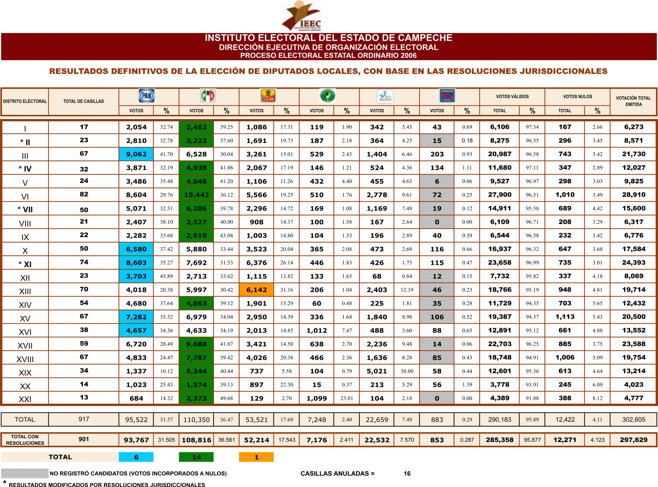De acuerdo a lo establecido en el artículo 169 fracción XIII del Código de Instituciones y Procedimientos Electorales para el Estado de Campeche, que señala que el presidente del Consejo General tiene la atribución de dar a conocer la estadística electoral por Casilla, Sección, Distrito, Municipio y Circunscripción Plurinominal, en un plazo no mayor de quince días hábiles, una vez concluido el Proceso Electoral; y el artículo 177 fracción VI del mismo ordenamiento que indica que le corresponde a la Dirección Ejecutiva de Organización Electoral llevar la Estadística de las Elecciones Estatal, Distritales y Municipales.